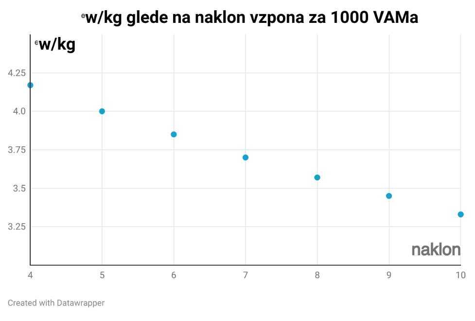 Če bi vsi kolesarili z močjo e4 W/kg, bi klance z različnimi nakloni odpeljali takole: