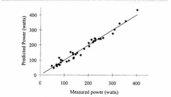 Kasneje so James C. Martin in drugi postavili matematični model računanja moči za cestno kolesarstvo (https://collections.lib.utah.edu/dl_files/b4/8e/b48ef26086091662c561e673d7bd990d77868437.pdf). Kot lahko vidimo na spodnjem grafu, je model zelo dober (črta predstavlja izračun, pike pa so vati iz merilcev moči). Model vključuje vse dejavnike, ki so pomembni pri končnem rezultatu.