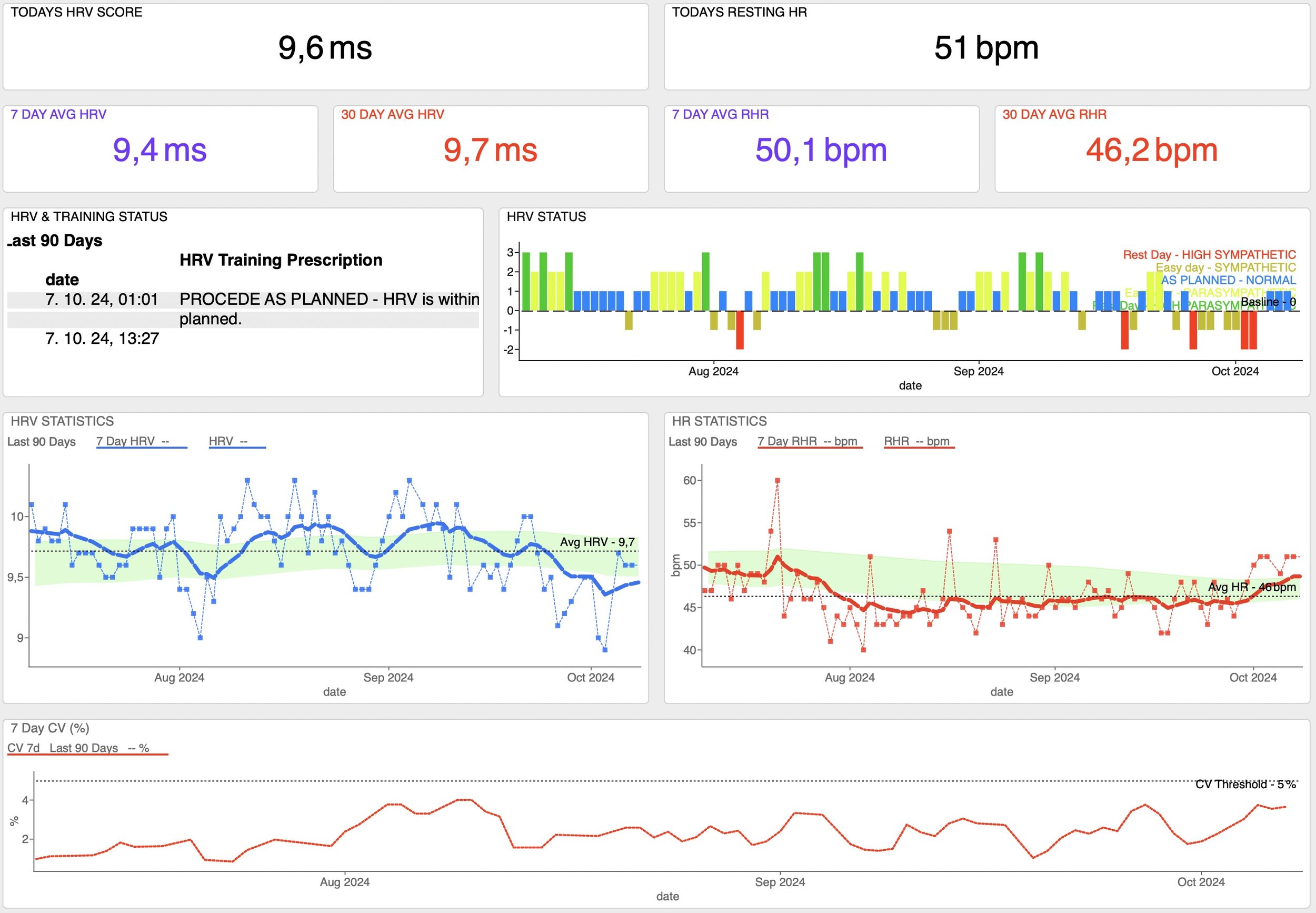 Dnevna nihanja: HRV je lahko zelo spremenljiv na dnevni ravni, zato ravnajte previdno. Nizka ali visoka vrednost HRV ne pomeni nujno, da ste preveč pod stresom ali popolnoma okrevali. Spremljajte spremembe HRV na akutni (nekaj dni) in kronični (tedni do meseci) osnovi, da dobite resnično sliko, kaj se z nami dogaja..