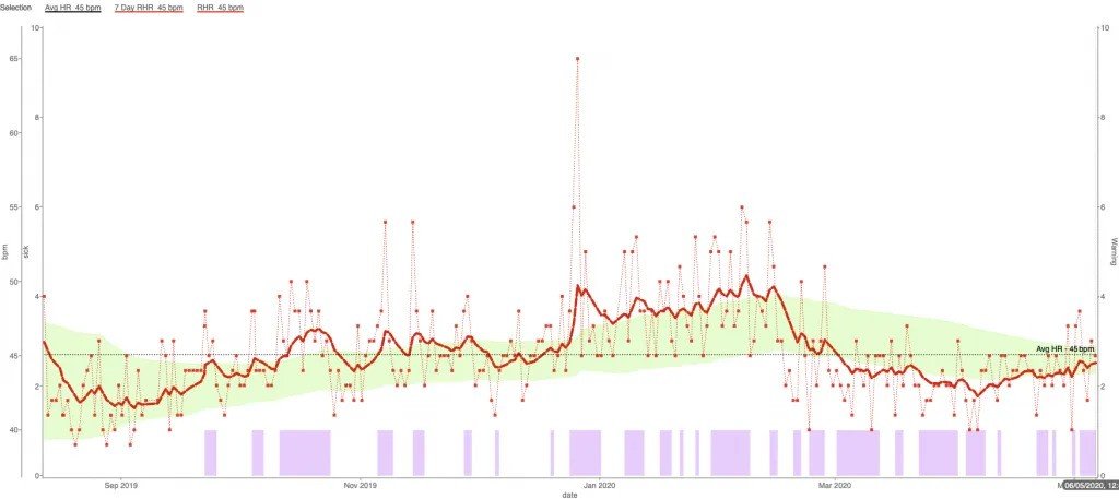 Začeli bomo z amaterskim kolesarjem, ki je spremljal HRV skozi več letno obdobje, in v teh letih se je veliko zgodilo, zato imamo kar nekaj zanimivih podatkov. Osredotočili se bomo na obdobje od avgusta 2019 do maja 2020. Poglejmo podatke.