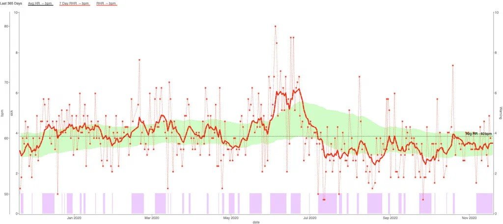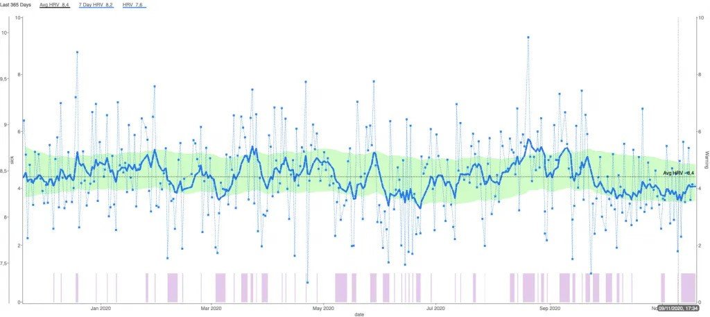 Celoten prikaz kako spremljamo HRV skozi čas. V tem primeru opazimo padec HRVja v zadnjih 10-14 dneh, na drugi strani pa rahel dvig HRja. Posledica posezonskega počitka, ki je pripeljal veliko več stresnih trenutkov v službi, kjer pa je lepo opazno, da tudi psihološki stres lahko vpliva na delovanje našega telesa.
